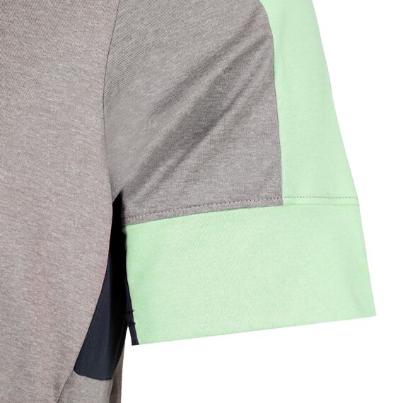 • Tecnología de microfibra de transferencia de humedad; escote redondeado con borde delantero adherido; inserciones de malla debajo de las mangas para mayor transpirabilidad; segundo tejido: malla 100% poliéster