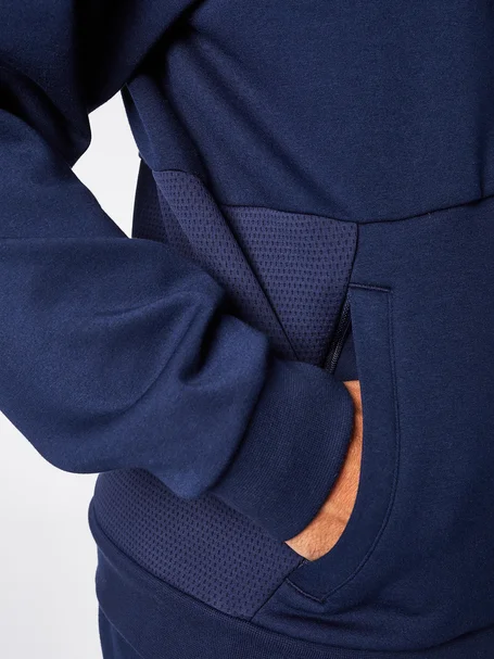 71% poliéster, 25% algodón y 4% elastano. 97% algodón, 3% elastano canalé. Forro 100% algodón en la capucha.