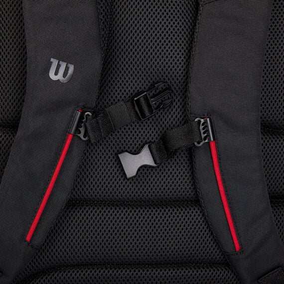 Se pueden guardar hasta dos raquetas de tenis en el bolsillo acolchado de esta mochila Super Tour, que tiene cremalleras con cierre. Las características adicionales incluyen un bolsillo ventilado ideal para ropa o zapatos sucios, un bolsillo lateral con cremallera aislado con Thermoguard para mantener frescos el agua o los refrigerios y una funda interna en el compartimento principal para computadoras portátiles o tabletas. Con su intenso color rojo y su emblema Wilson en relieve, el diseño creativo de esta bolsa complementa perfectamente la gama de raquetas de alto rendimiento Clash v2. Está fabricado con tejido exterior de poliéster PET reciclado creado a partir de 10 botellas de PET.
