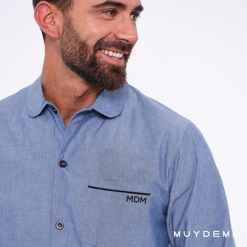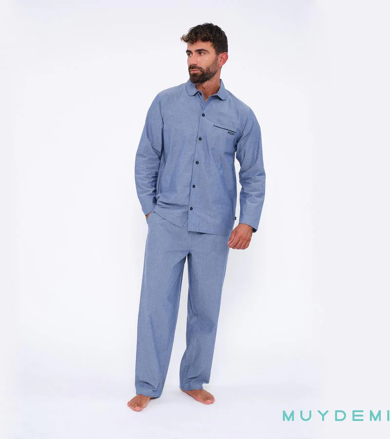 Pijama camisero en popelín azul para hombre. Pantalón con bolsillos.