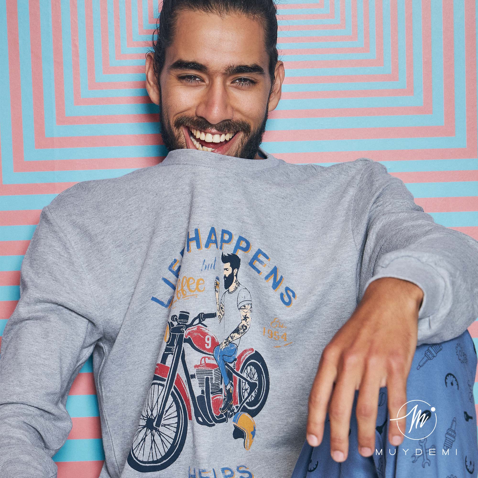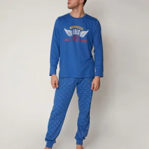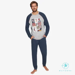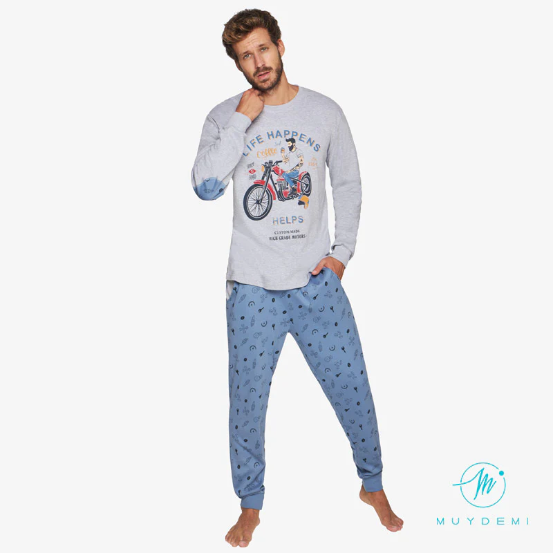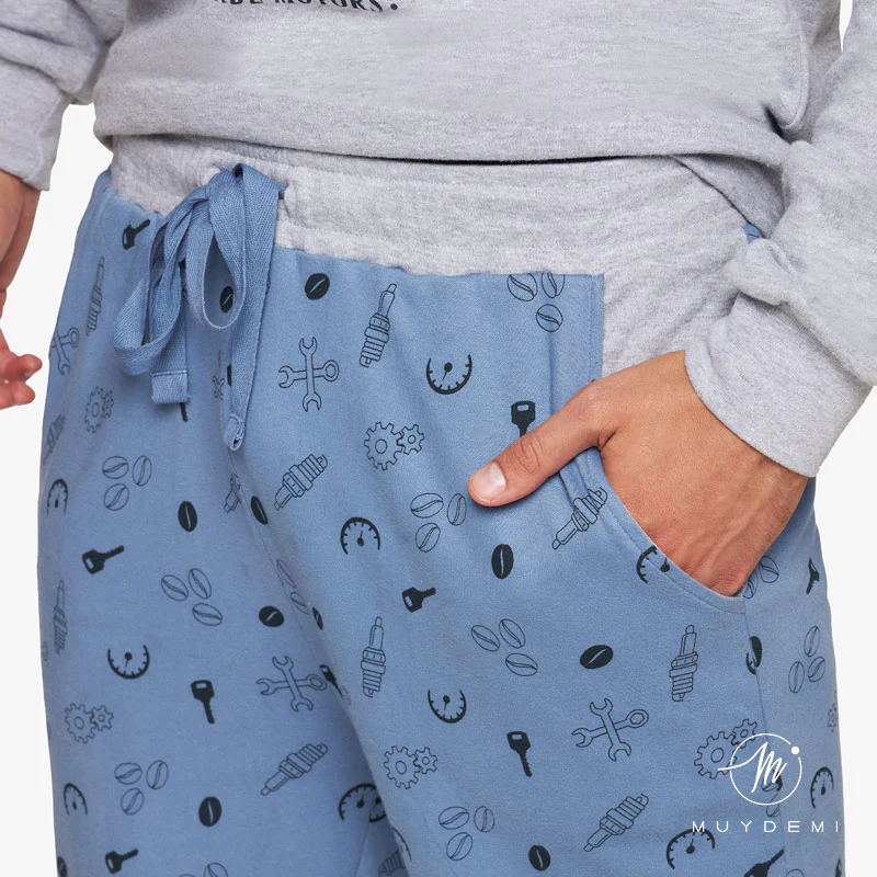 Pijama de hombre para los amantes de las motos. Lleva camiseta con estampado muy motero, los pantalones son estampados y llevan bolsillos. Además llevan puño para que no se desplacen y entre el frío.