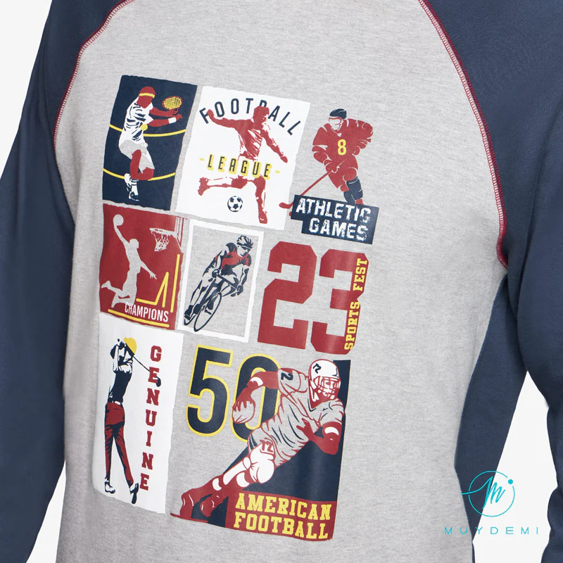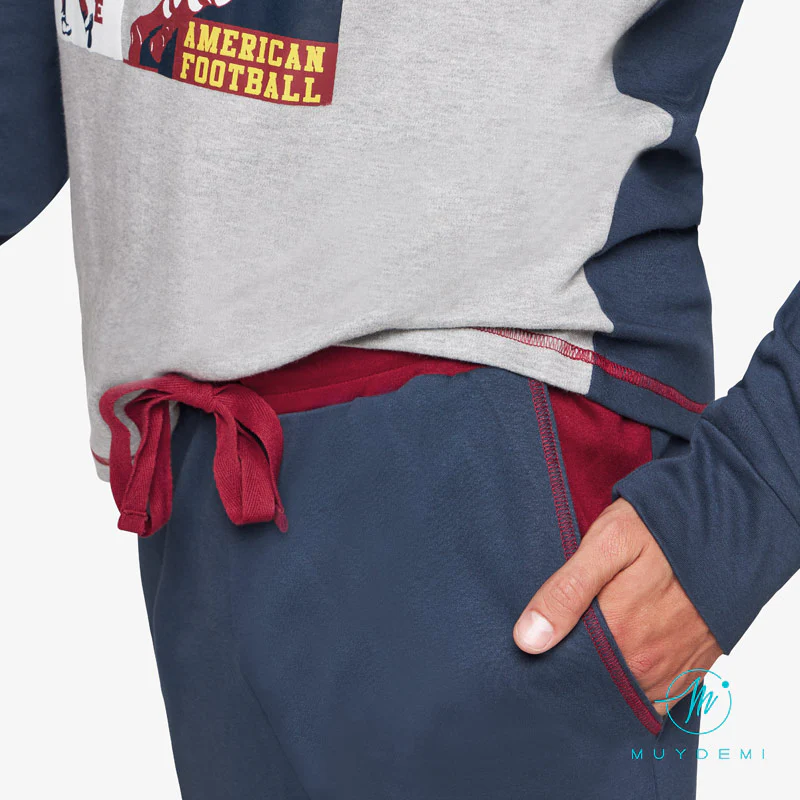 Pijama de hombre para los amantes de los deportes. Está confeccionado en algodón con felpa por dentro, tiene un tacto muy suave y su camiseta lleva un original estampado con los deportes más practicados del mundo. Los pantalones llevan bolsillos, puño inferior y cintura regulable para que estés cómodo y no se desplace.
